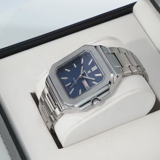 • Design géométrique : Le cadran à la conception géométrique avec des index clairs, des lignes précises et un affichage du jour et de la date intégré offre une visibilité et une harmonie parfaites.