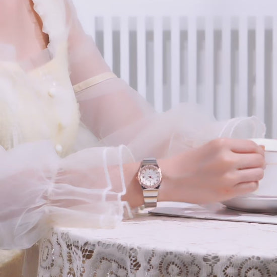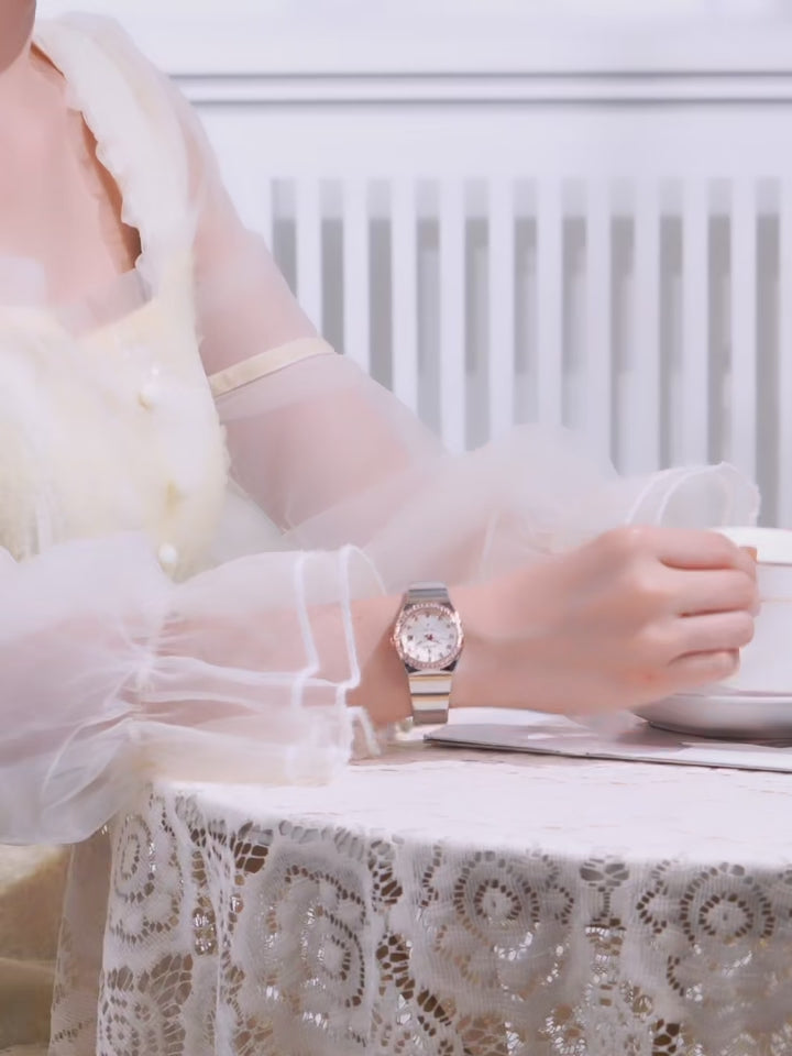Une montre pour femme qui allie romantisme et raffinement. Son boîtier délicat en acier inoxydable et son bracelet élégant en font le compagnon idéal pour les grandes occasions comme pour un quotidien chic.